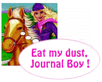 I've been working on some of the design ideas I have for expansion of this site and others, working on some graphics, and just generally getting all McLuhany. When the visual side of me gets going, my verbal motors spool way down to idle, which is easy for them to do in an environment where I don't do much talking with folks who are older than seven. But the ideas and logic in the realm of imagery can have a momentum in them unseen in the world of words, and it's much easier for me to lose track of time when I'm immersed in pictures. Working in the darkroom comes to mind. The non-linear subconscious really fires up, and things happen in flashes rather than verbally syntactical equations. Pattern recognition and spatial relationships can be deeply penetrating emotionally, and can snap a brain into understanding something in a way that is neither available in words, nor measurable for its utility. There is something inherently subjective about responses to photographs, and it's this risk, this gamble on emotional understanding, that makes good photographs or paintings or any other non-verbal pieces so potent. A special relationship happens between the creator and the viewers, partly because when viewers "click" with a picture it happens in spite of the fact that it has not been explained to them, whereas the very nature of the usual forms of verbal delivery is essentially one of having it explained. But looking for and finding that hint, that first inkling of elements lurking in an image which, when improved or enlarged or juxtaposed can cause a synthesis among previously unconnected contexts, well, scoop me out and call me punkin', that's when I become a happy boy. So I've been kind of quiet lately, partly out of choice, and partly because after all these pichers I get to feelin' kinda stoopid when it comes to using words right. They just don't seem to be there sometimes. Sentences go half finished. I stare more. * * * * * * * The other part of why I'm not writing here as much as I'd like to involves Amy getting the Barbie Riding Club® computer game for Christmas. After all these years of trying to convey the concept of sharing, she's gone and used it against me, the little slyboots, knocking so sweetly on my office door, and telling me that she really really really needs the computer so she can ride Buttercup now. "She needs her sugar cubes and carrots, Dad." "Screw Buttercup and the cd-rom she rode in on." I snarl. But it comes out sounding like "Okay. Sure. Come on in." She walks in and plops down in my chair to go galloping past waterfalls and rainbows while I mutter about laptops and how wide the gulf seems between willingness and funding. I look to the future in hopes of seeing a 15" XGA Active Matrix TFT color screen. But there are obstacles. Luckily, Barbie is teaching me how to jump over them. |